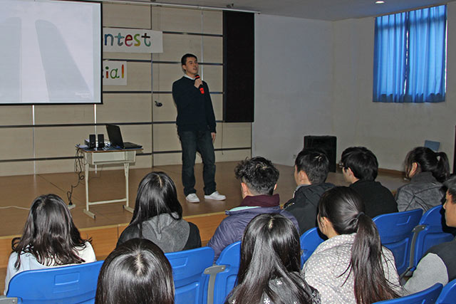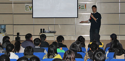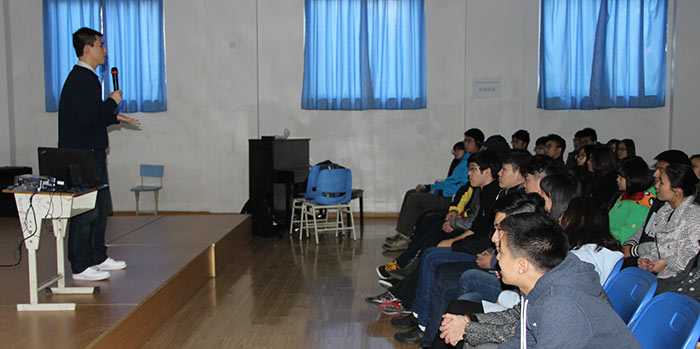 首先,燕曉亮與融合部同學寒暄了一陣,因為大部分同學他都認識。緊接著,他對喬治亞理工學院做了介紹,讓同學們了解了該大學的錄取要求。他用短片展示了大學的學習與生活。