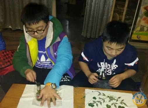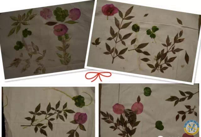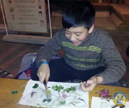將染色植物放在待染的白布上用,小錘在砸出汁,形成想要的構(gòu)圖和色彩。話(huà)說(shuō)這小伙兒是不是笑得太開(kāi)心了點(diǎn),看來(lái)作品很值得觀賞呢。