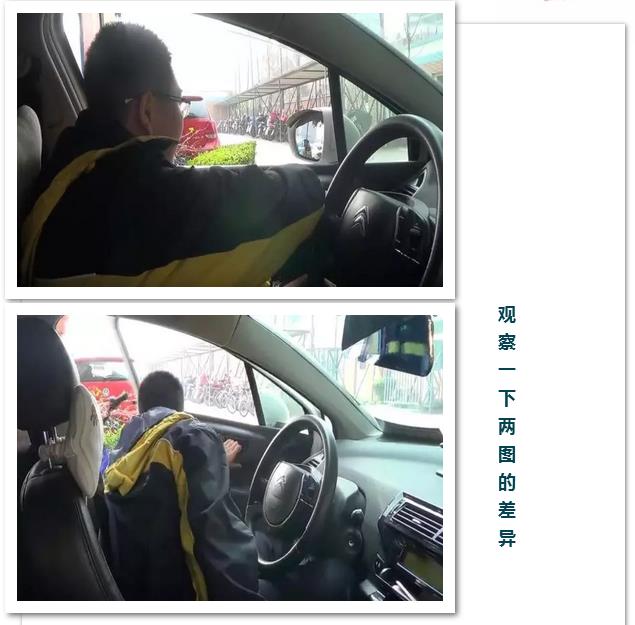 2. 上圖學生上半身側向一邊,眼觀后視鏡,車門未開。下圖學生上半身傾出,車門大開;