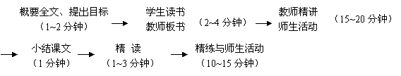 學生讀書和教師板書,二者一般同步進行。學生讀書環節很重要。通過“概要全文”環節,學生對課文有了大致了解,然后帶著問題讀書,學生既預習了課文,又加深了課文印象,由被動學習變為主動獲取,為教師“精講”環節作好了準備。