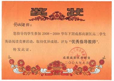 2009年成都高新區高中學生英語閱讀競賽“優秀指導教師”