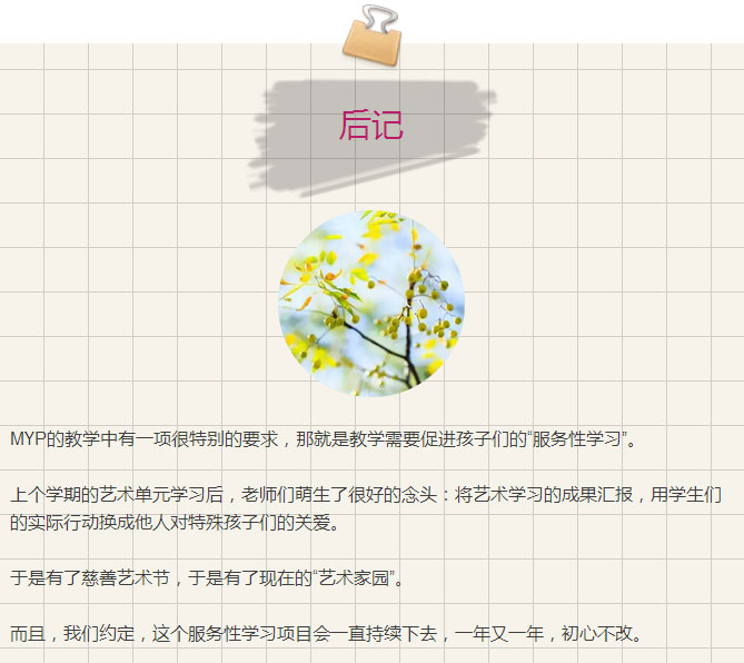 如期而至的日子在今年,在今天,對于我而言,卻有了特別的意義。就在昨日,成都市青羊區特殊教育中心迎來了“藝術家園”的掛牌儀式。而在這背后,那些閃爍著星光的故事,卻與我們——MYP的小伙伴們息息相關。