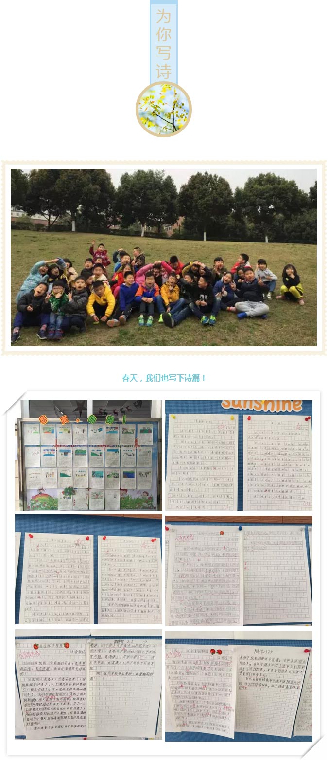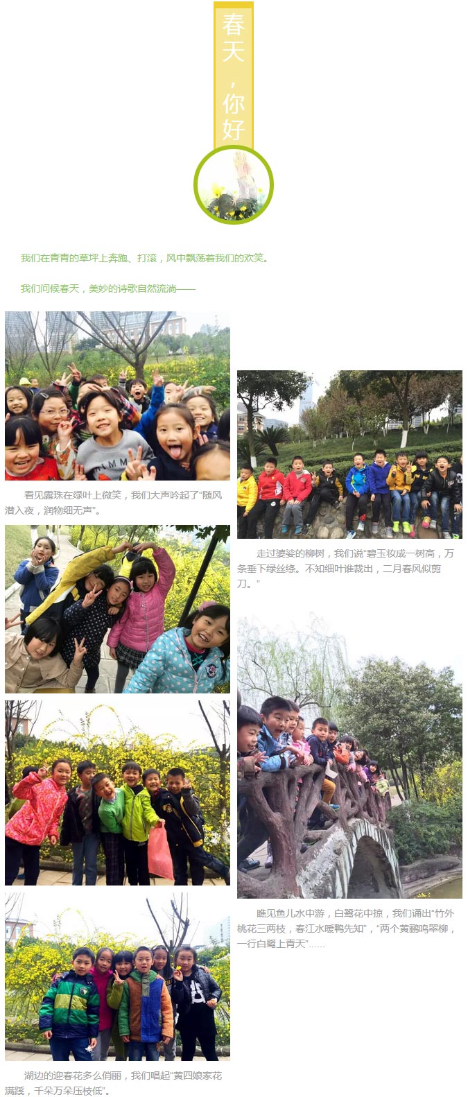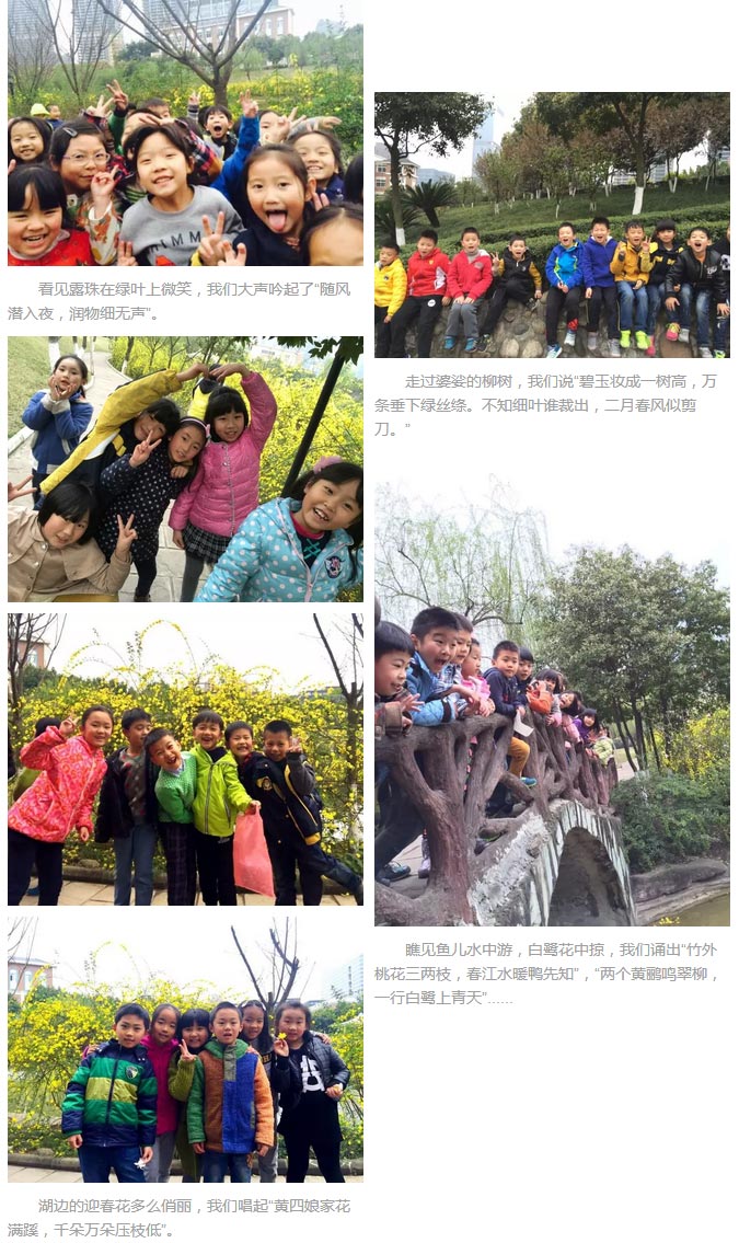 清晨,二年級的乖娃娃們漫步在美麗的月牙湖邊,呼吸著清新的空氣,欣賞著金黃的迎春花、粉紅的桃花。