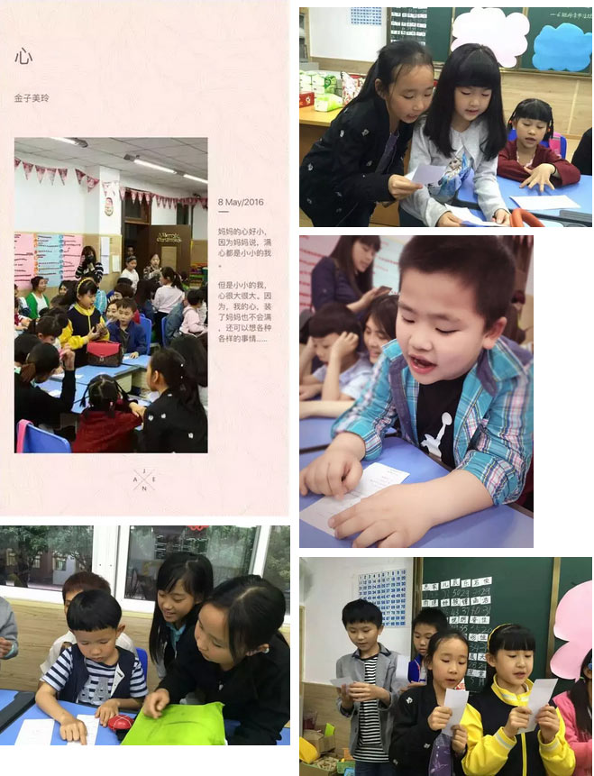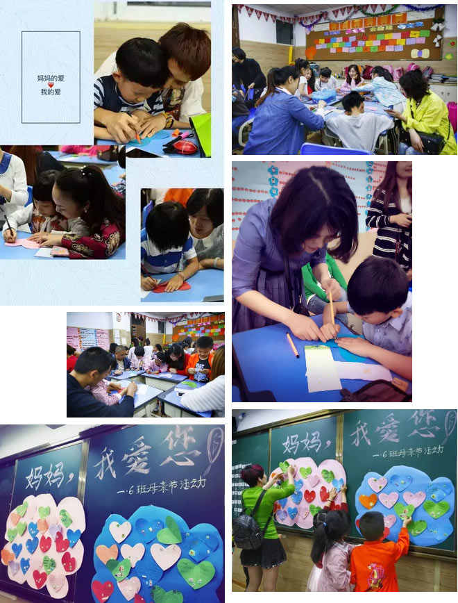 聽完溫馨而充滿童稚的小詩,媽媽們和“小小”的寶貝們一起制作表達愛意的卡片,裁剪、粘貼,一張心形的卡片就初步完成,然后寫上寶貝對媽媽的祝福和媽媽對寶貝的期望,“媽媽,我愛你!母親節快樂!”“寶貝,希望你健康成長”……一張張充滿愛意的卡片貼滿了黑板,也貼在了每個媽媽的心上,暖暖的。