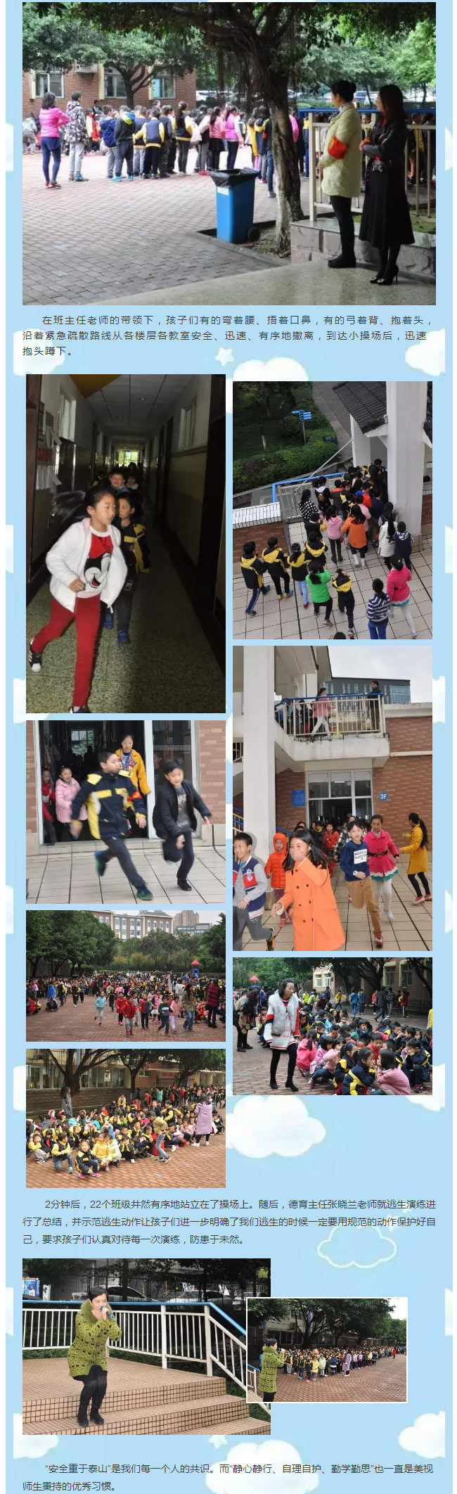 人的生命只有一次,安全永遠是孩子們健康、快樂成長的第一要素。美視一直注重培養孩子們的自我保護能力。只有學會自我保護,遠離危險,我們的孩子才能擁有幸福美好的生活。“百善孝為先,萬思安為重”。雖說災難不分時間,殘酷無情,但我們秉承“平時多一次演練,危難時就多一份希望”的教育理念,堅持帶領孩子們進行應急疏散演習訓練,防患于未然,在潛移默化中提高全體師生的安全意識和自防自救能力。 “春種一粒粟,秋收萬顆子。”春天是個播種的季節,孕育著希望的開端,預示著未來的收獲。而孩子們正值人生的春天,為他們播下“安全”的種子,我們祝福他們平安一生、一生平安!