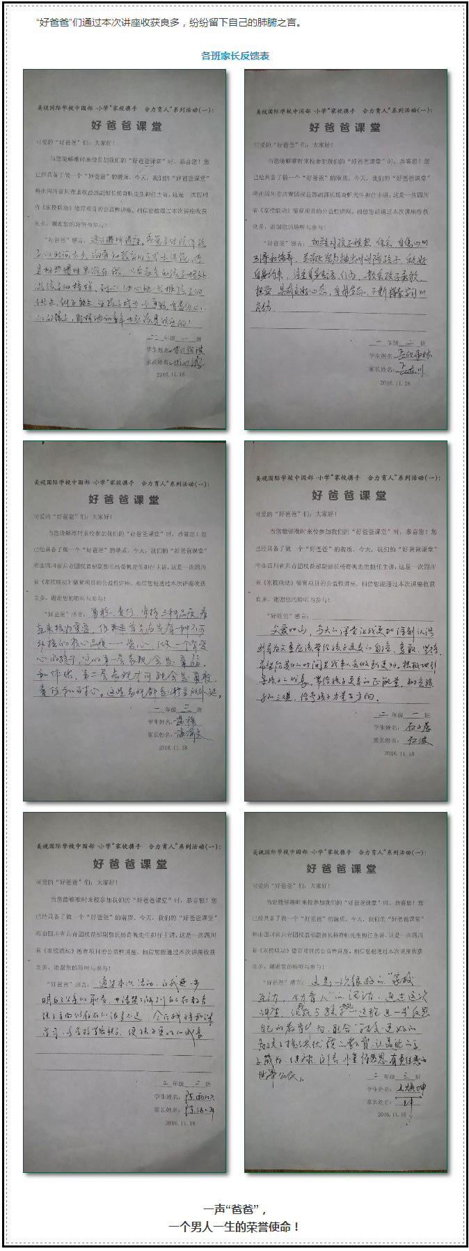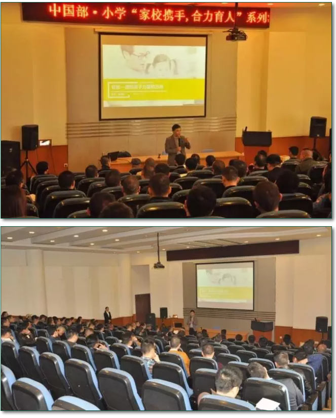 父愛如山,高大而雄偉; 父愛如水,清澈而甘甜; 父愛如火,熱情而嚴厲。 生活中, 父愛不如母愛偉大,它普通而平常; 父愛不如母愛深刻,它淺淺地在生活中印下道道痕跡; 父愛不如母愛美麗,它是撒在生活中的點點滴滴。 然而, 父親卻在家庭中擔當了非常重要的角色, 是家庭教育不可或缺的部分。 如何出色地扮演這個角色, 值得每一位爸爸用心地思考和學習。 四川省共青團權益部副部長 楊奇帆 先生 中國部·小學 ,一二年級學生的爸爸 《父親——給孩子方向和力量》 父教的重要性 爸爸 不管是因為愛玩,還是真的很忙 請停下你的腳步,聽聽孩子的聲音 孩子的成長不會為誰而等待 錯過,就真的錯過了 不要總說,“我也想啊,可是……” 有時候做不到,其實是因為你還不夠想。 楊老師告訴在座的爸爸們:“‘父教’對于一個孩子的成長極其重要,爸爸對孩子一句鼓勵的話是媽媽鼓勵作用的50倍,“父教”甚至決定著孩子人生的發展方向,所以父愛不容缺失。 然而,現今整個社會父親教育的缺位已然成為一種社會現象。” 缺少父愛的孩子會怎樣? 現今很多家庭教育中父親教育缺失,有些父親對待孩子要么完全放手不管,要么就簡單武力解決,從近幾年的研究中發現,這樣的孩子人際交往中往往存在被動、對愛認識錯誤、不敢擔當等問題。 什么才是真正的父愛? 今天的父親不需要長時間的陪伴孩子,僅需要在陪伴中以身體力行的方式給孩子傳遞出一種正確的觀念。真正的父愛是講究尊重、奉獻、以及捍衛,這樣才能讓孩子感受真正的父愛。 《父親》感動全場 信息時代,手機如影隨形,為我們的工作和生活提供了很多便利。生活中,年輕的爸爸媽媽們習慣了用手機打發時間,卻忘記了作為父母最重要的是陪伴孩子成長。 陪著不等于陪伴,高質量的陪伴就是用心傾聽孩子,和他們做朋友。 視頻播放了一個七歲小男孩一首《父親》感動全場:在一個七歲小男孩的記憶里,爸爸只牽過他兩次手,就這僅有的兩次手掌的溫度讓孩子一直溫存在心! 陪伴是多么強烈啊,孩子多希望能這樣一直牽著爸爸的手,一起走……