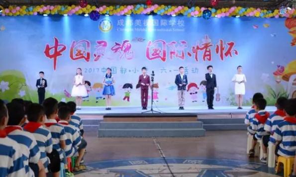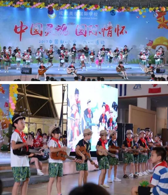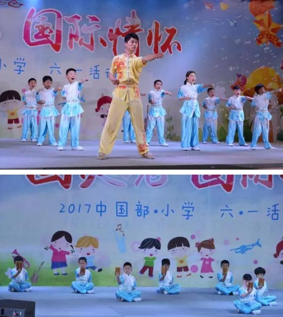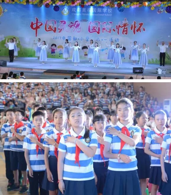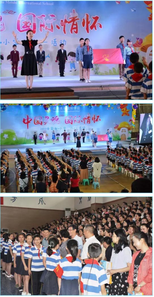 瞧!在音樂王老師的指揮下,中國部·小學的全體乖娃娃們正齊唱隊歌,向著莊嚴的隊旗敬禮,每一個少年胸前掛著鮮艷的紅領巾,大家唱出了少先隊員的驕傲,唱出了中國人的自豪。