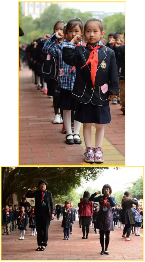 隨后,新少先隊員們在隊旗下齊聲宣誓:“我是中國少年先鋒隊隊員。我決心遵照中國共產黨的領導,好好學習,好好工作,好好勞動。準備著,為共產主義事業而奮斗!時刻準備著!”