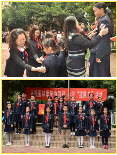 “ 鮮艷的紅領巾迎風招展,火紅的隊旗高高飄揚,鏗鏘的誓言響徹云霄,少先隊員們懷著對未來無限的憧憬和堅定的信念大步向前。 在這桂花飄香的金秋十月,美視校園里光榮與笑容齊飛,傳承與感動相映。 我們也感謝參與活動的爸爸媽媽們,謝謝您們的陪伴。 讓我們繼續攜手,為培育出熱愛生活、懂得感恩、與人為善和明禮誠信的孩子而共同努力。