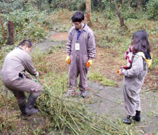 融合部的IB學(xué)子帶著對(duì)國(guó)寶大熊貓的熱切期盼于18日下午踏上了征程,一路上大家分享著碧峰峽基地的基本情況和大熊貓的萌照,歡聲笑語(yǔ)到達(dá)了基地。正式的服務(wù)從19日早上開始。一大清早大家就要起床,打掃熊貓的“公寓”,讓它們有一個(gè)清潔干凈的生活環(huán)境。緊接著就要去搬運(yùn)熊貓們一天的“口糧”----竹子,將竹子劈成小塊以方便可愛的熊貓寶寶進(jìn)食。中午的時(shí)候同學(xué)們分成不同的小組喂養(yǎng)自己小組的大熊貓,看著熊貓們?cè)谧约旱恼展芟掠迫坏厣睿瑢W(xué)們心里都有說(shuō)不出的高興。