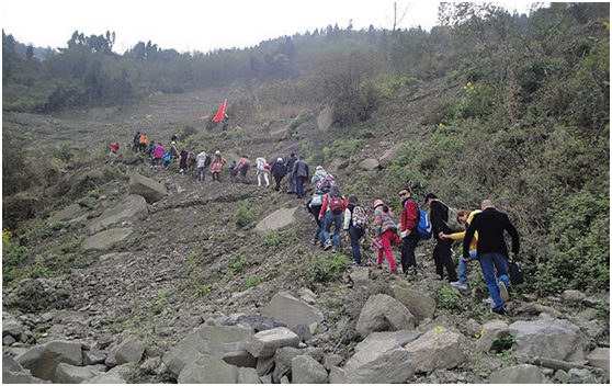 山花爛漫,滿目春意盎然。徒步登高遠眺,這個曾經創痕累累的小鎮,在春意的感召下,顯得格外生機勃勃。我們邊走邊在陡峭的山坡上尋找今年種植的地方。