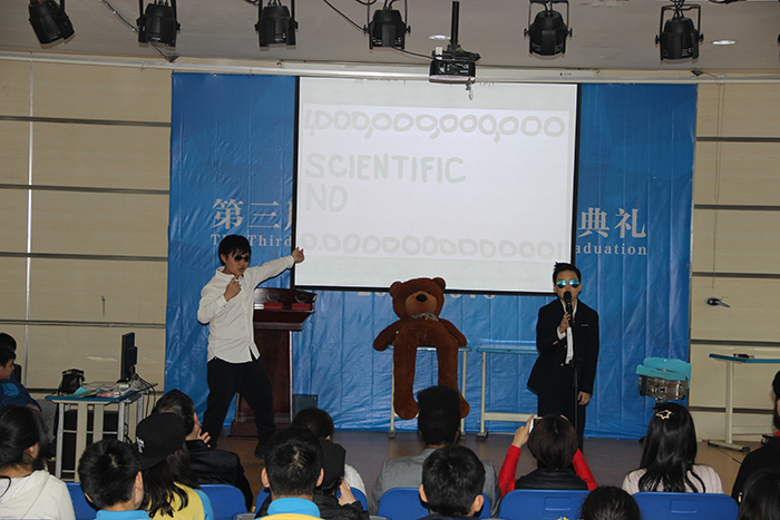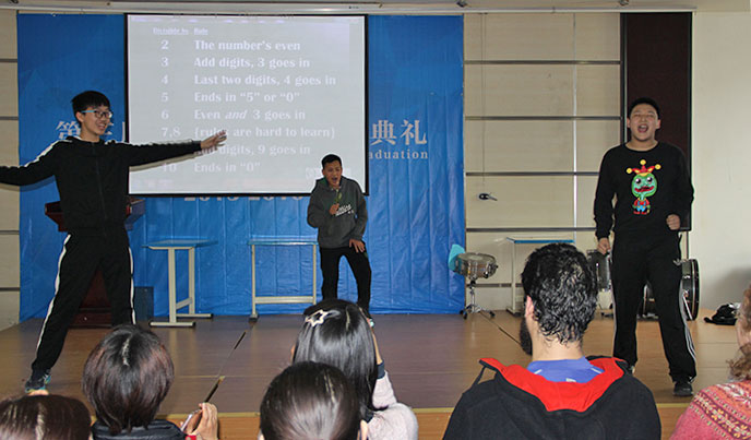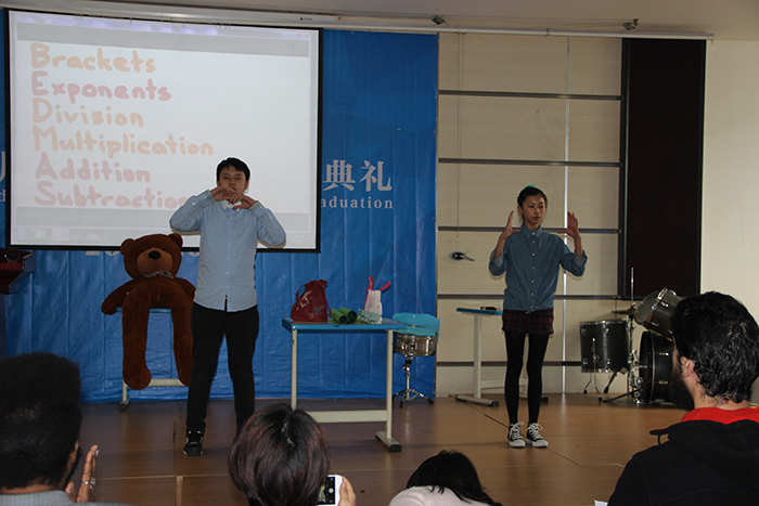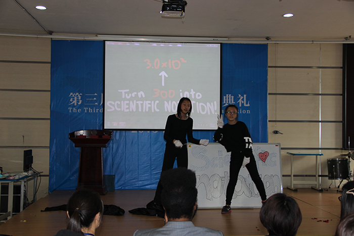 2016年3月4日下午在融合部禮堂里舉行了數學唱歌比賽,這次比賽由初中數學老師Ms. Jadie Wang組織,初中學生參加。同學們分年級分組進行表演,他們邊唱邊跳,現場氣氛熱烈。融合部劉校長、副校長Mr. Kevin Blissett 以及部分老師和小學生也作為觀眾,在現場觀看了比賽。最后來自8年級的2組同學們獲得了這次比賽的第一名。