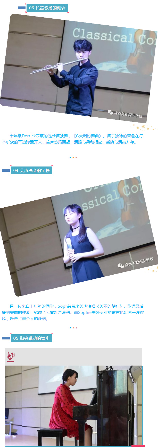 來自七年級的Gina帶來的鋼琴演奏,這是一首來自門德爾松的《無詞歌》。門德爾松的鋼情曲以精美、優雅、華麗著稱。所有人都跟著Gina享受著鋼琴美麗的旋律。
