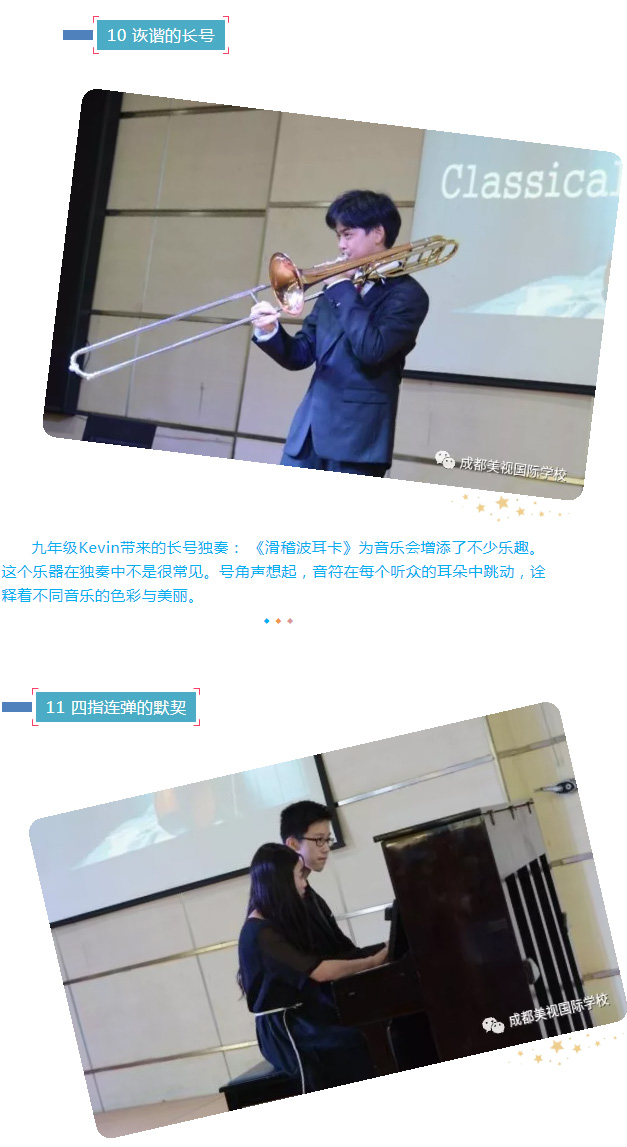 九年級Teresa和Jerry合作帶來的鋼琴表演《Mozart sonate kv.381》。四手聯彈的默契為這首曲子帶來新的生命力,飽滿而又豐富的琴聲徜徉在整個禮堂中,為此次音樂會畫上一個圓滿的句號。