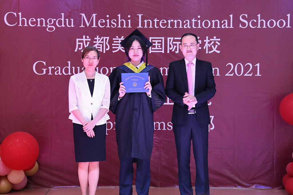 接下來IB部劉校長與DP協調員Mr.Lorry為畢業生頒發證書。劉校長代表IB部為獲得斯坦福offer的畢業生Sera頒發紀念品。