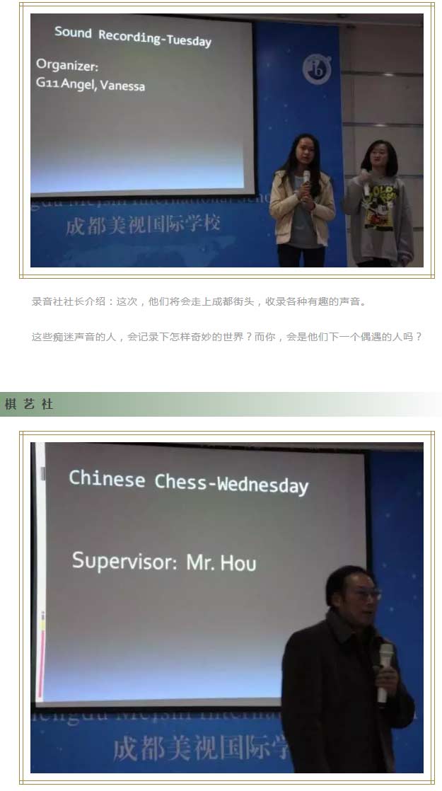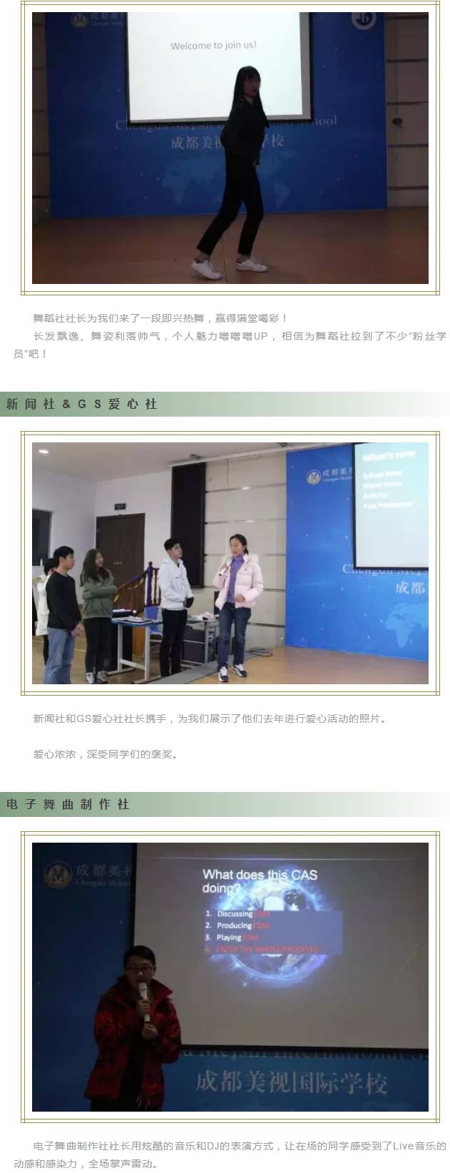 此次CAS新開展的活動有:戲劇社,舞蹈社,新聞社,電子音樂制作社,錄音社,還有老師們組織的網球社和棋藝社。