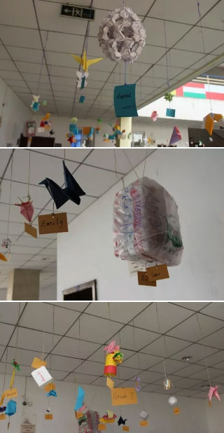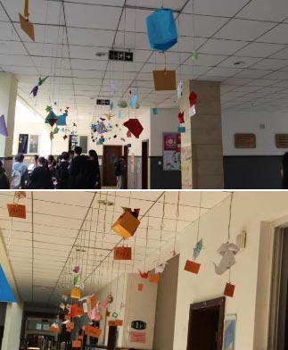 同學們用不同形式、不同材料詮釋著對幾何美的理解,融合部一樓的走廊瞬間成為了圖形的海洋、幾何的天地。