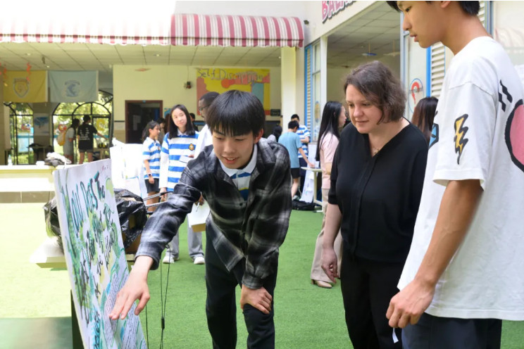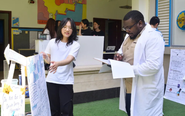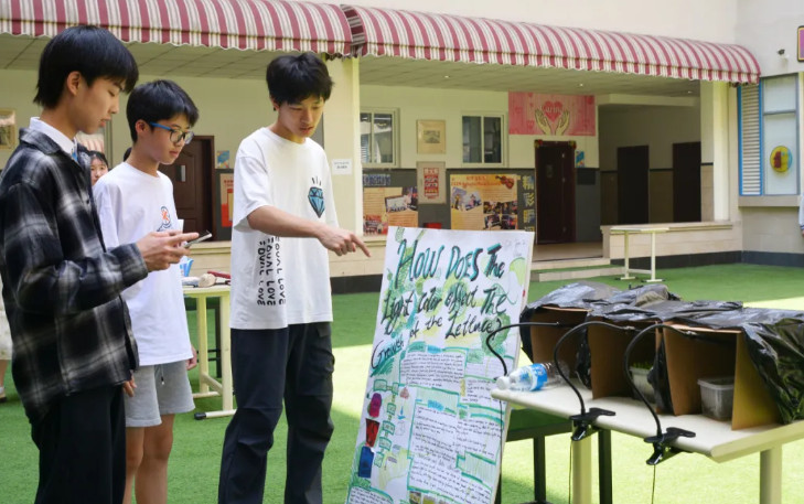 活動伊始,九年級學生David憑借自制的簡易“等離子炮” 點燃全場熱情,電磁現象的動態演示讓觀眾們驚嘆不已。緊接著,Alice、Emma L、Jasmine三位同學將熱水與干冰巧妙混合,升騰的白色霧浪瞬間營造出如夢如幻的科學舞臺,為展覽拉開序幕。