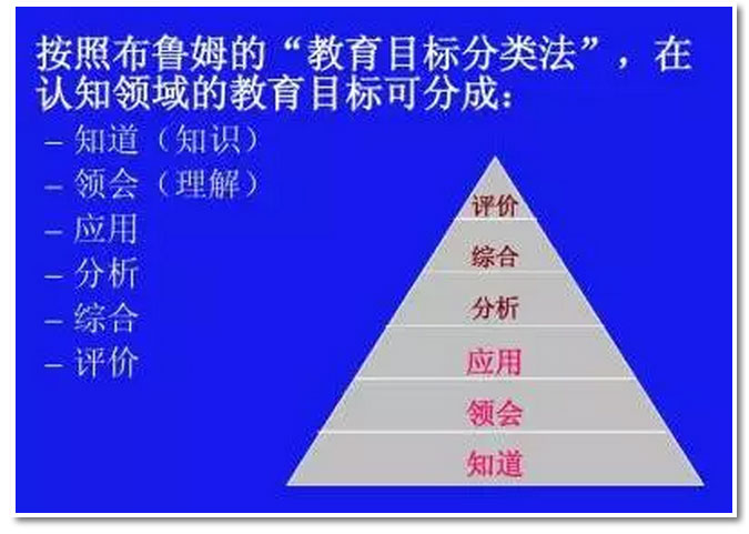 布魯姆思維層次分六個方面,從低到高依次是記憶——理解——應用——分析——評價——創造。知識和技能的學習通常只能發展三個層次,從“記憶”到“應用”,而有概念的參與,可以從“理解”到“創造”五個層次上發展思維。