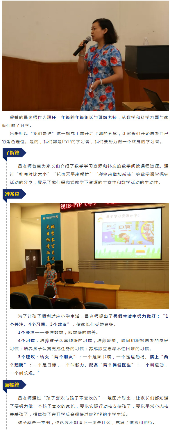 放暑假了,IB-PYP雙語班的孩子們帶著滿滿的收獲暫時離開學校,留下一園清寂。6月28日早上,PYP雙語班一年級新生的家長們來到學校,參加我們以“幼小銜接”為探討話題的家長工作坊。新生家長們的熱情到來,又令暑期的校園恢復了活力。