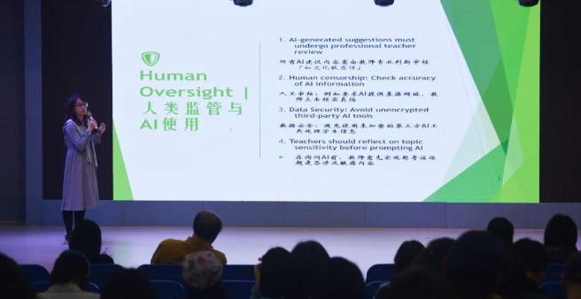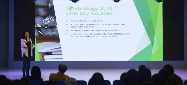 IB教師工作坊培訓官、華東師范大學與上海交通大學特聘導師李蓉老師帶來主題為“與AI共同成長”的講座。講座圍繞人工智能對基礎教育的挑戰與更新、基礎教育的應對策略以及如何與AI共生三個方面展開。李蓉老師詳細講解了人工智能的定義、發展、類型及其與人類智能的對比、人工智能的局限等問題,并結合案例分析了中小學校在推進人工智能進程中的現狀與應對辦法。