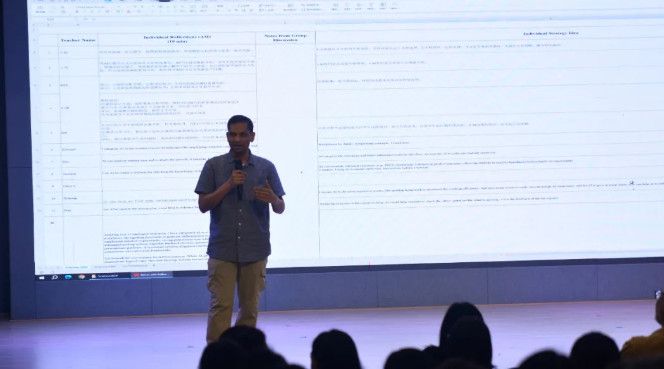 在小組討論環節,老師們分成小組頭腦風暴,討論人工智能在教學、學習和評估中的應用。大家共同探索了人工智能在提升課程設計、教學和評估方面的潛力,并分享了當前的實踐經驗,集思廣益地提出創新的 AI 解決方案,并確定可以在課堂實施這些方案的具體步驟和策略。