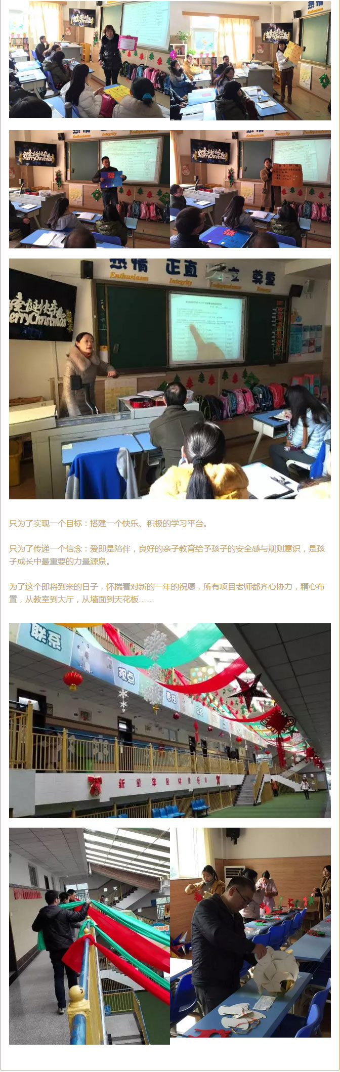 暖陽當(dāng)空,寒水疏柳,也顯出媚眼的姿態(tài)。一場(chǎng)大型的游園活動(dòng)即將開始。項(xiàng)目樓內(nèi)歡聲笑語,笑容如冬日暖陽般燦爛。此刻,孩子們與親愛的爸爸媽媽手牽著手,完成簽到程序后,開始了為時(shí)90分鐘的親子游園會(huì)。這是小學(xué)部PYP項(xiàng)目年級(jí)家校學(xué)習(xí)社區(qū)的又一次行動(dòng);這是學(xué)校、家庭和孩子的教育合作;這是學(xué)習(xí)社區(qū)里每一個(gè)成員的再次相互學(xué)習(xí):文明、有序、遵守規(guī)則。