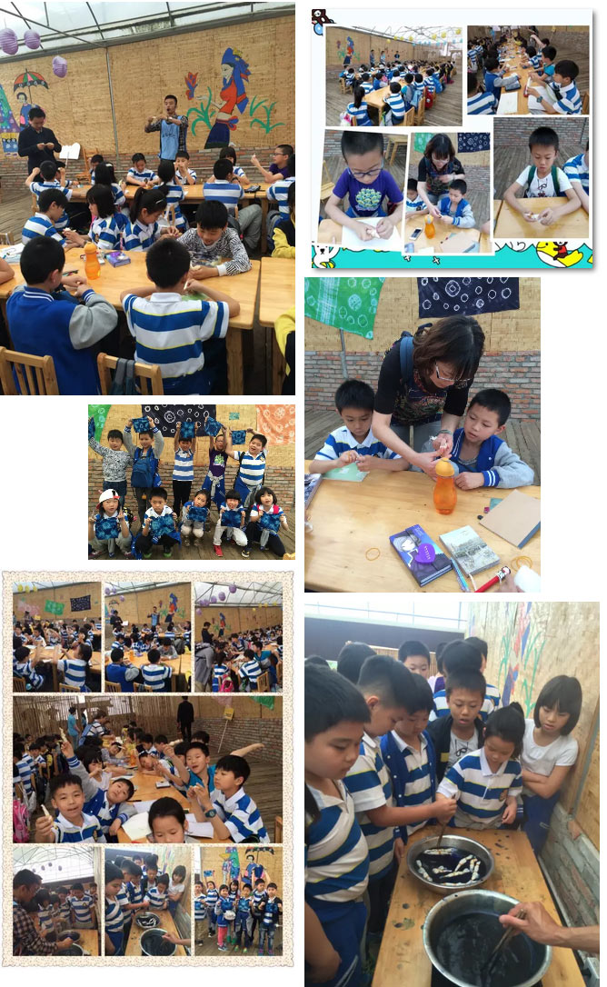 我們先跟著熊大哥哥來到了一個小木屋房子,原來這里是民族藝術(shù)館,里面放有正方形的棉布,還有木桌子和木凳子。我心里疑惑地想:“這到底在干嘛呢?”一聽老師講解才知道我們馬上要體驗“白族扎染”。老師說:“我們要把白棉布染成一個五角星,制作過程簡單:先要折圖案,捆扎好,接著用清水浸泡,放進染鍋染色,最后沖洗晾干。”我們在老師的帶領(lǐng)下有條不紊地一步一步地做。當我的染布洗出來時,先把橡皮筋都通通取下來,然后把染布打開一看,哇!我染布的圖案并不是五角星,而是一個“人”。小曾的是從大到小的卡通星星,小張的是一個大星星。同學們的圖案都是五花八門的,最漂亮的要數(shù)羅老的。