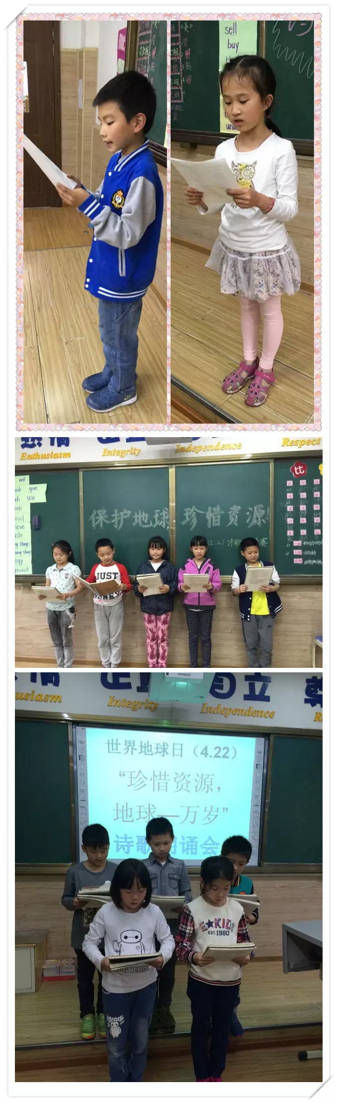 在4月22日——“世界地球日”這一天,孩子用各種方式表達了對地球媽媽的愛。愛在行動上——“愛心行動小組”的孩子們,有的幫助清潔工阿姨打掃衛(wèi)生,有的去操場拾垃圾,有的去制止那些不愛護花草樹木的行為,甚至有的同學下午回家后還和父母在小區(qū)開展了“愛心行動”呢!這一天,我們各班還舉行了“珍惜資源,保護地球”的詩歌朗誦比賽呢!愛在詩歌朗誦里,愛也在深情地呼喚里:“只有一個地球,地球資源不是取之不盡用之不竭的;只有人人愛地球,地球才會愛人人……”