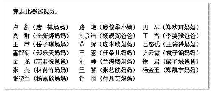 (竟走巡視員為一名老師和一名家長(zhǎng)負(fù)責(zé)一個(gè)點(diǎn),主要的是監(jiān)督各比賽隊(duì)伍是否犯規(guī),要求只能走不能跑,如發(fā)現(xiàn)有跑的現(xiàn)象,就及時(shí)提示,并作好記錄,發(fā)現(xiàn)一次跑比賽成績(jī)上加5秒,三次以上將取消比賽成績(jī),直接評(píng)為第六名)