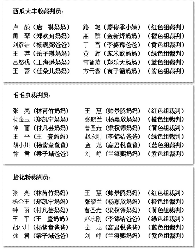 (西瓜大豐收、毛毛蟲(chóng)、抬花轎的裁判員兩人(家長(zhǎng)志愿者和老師)一組負(fù)責(zé)一個(gè)組,主要是清點(diǎn)比賽隊(duì)伍的人數(shù),負(fù)責(zé)提示比賽中不要犯規(guī))“逼著”大朋友們參與運(yùn)動(dòng),綠色健康生活從自己做起!因此,讓我們期待大小朋友們的默契與合作吧?。ê罄m(xù)報(bào)道將在我們的“回味篇”中呈現(xiàn)。)