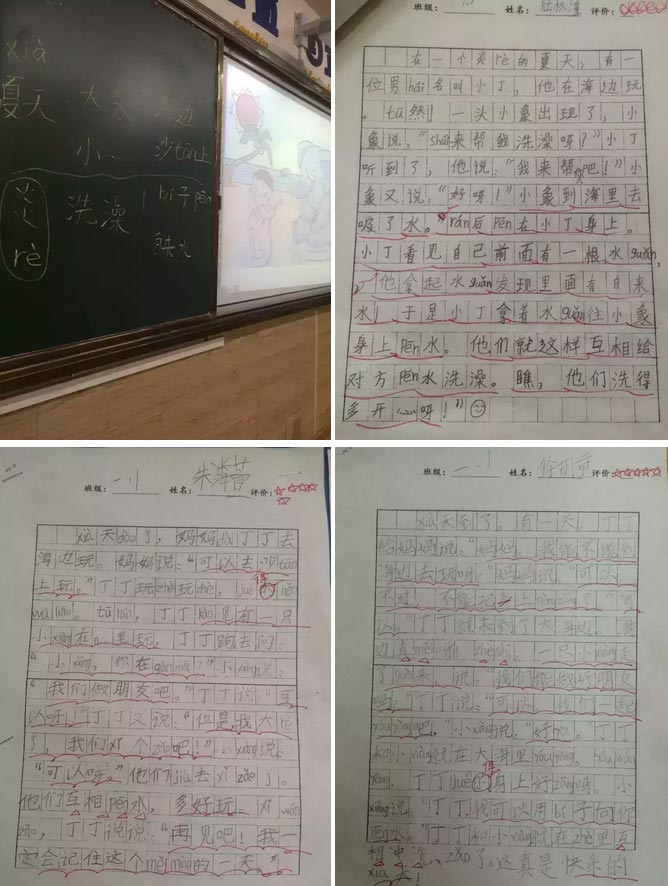 驕陽底下,小朋友和小動物的溫馨互動,展現了夏日的生機。瞧,我們用稚嫩但輕快的語言描繪了單純又快樂的心情。