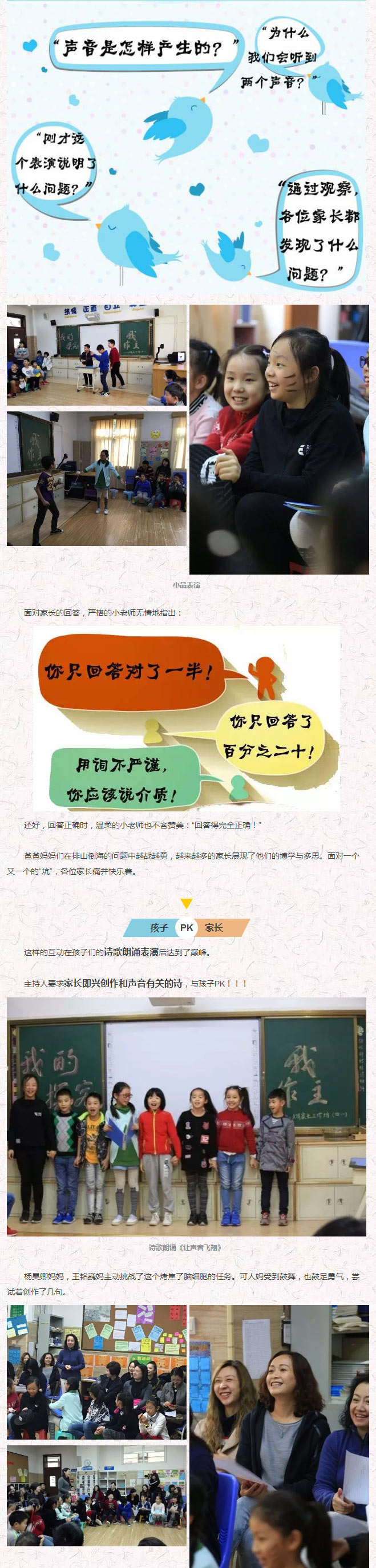 四·一班家長(zhǎng):馮可人同學(xué)的媽媽按照原計(jì)劃,朕準(zhǔn)時(shí)抵達(dá)四(一)班的教室,參加“我的探究,我做主” 超學(xué)科探究分享會(huì),通過(guò)對(duì)聲音和光物理特性的了解,促進(jìn)實(shí)際運(yùn)用。朕以為這只是一堂普通的公開(kāi)課。環(huán)顧四周,每一位家長(zhǎng)臉上都帶著笑,輕松交談,愉快聊天。然而,生活的魔力就在于——你永遠(yuǎn)不會(huì)知道前方有什么在等著你。兩位小主持人信步走上講臺(tái),簡(jiǎn)單的開(kāi)場(chǎng)白后,拋出了第一個(gè)問(wèn)題:“各位爸爸媽媽?zhuān)銈冎牢覀兘裉焯骄康闹行乃枷胧鞘裁磫幔?rdquo;馮可人媽媽主動(dòng)回答,回答了一半被制止。回答錯(cuò)誤,慘被打臉。主持人繼續(xù)追問(wèn),誰(shuí)能回答這個(gè)問(wèn)題!家長(zhǎng)們說(shuō)笑的聲音開(kāi)始變小,直至消失,教室里安靜了下來(lái)。終于,潘夢(mèng)圓媽媽挺身而出,回答正確,解救了全班家長(zhǎng)。這個(gè)殺傷力驚人的下馬威讓所有的爸爸媽媽都陡然緊張起來(lái)。隨著課堂內(nèi)容的展開(kāi),小品表演《聲音的產(chǎn)生》《聲音在氣體中的傳播》《聲音在固體中的傳播》《聲音在液體中的傳播》,問(wèn)題一個(gè)比一個(gè)尖銳。