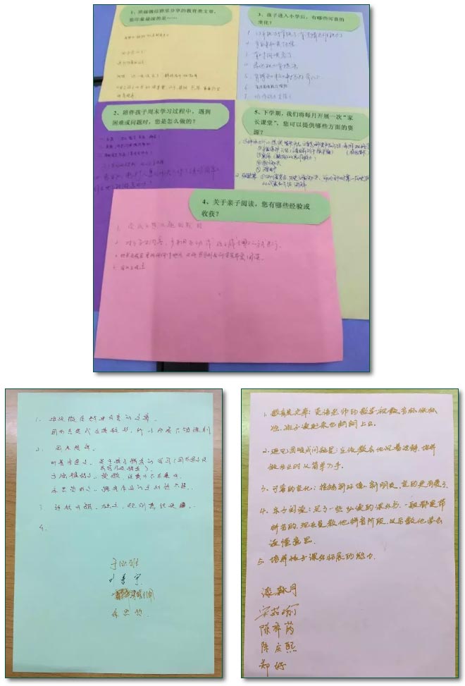 每個班都有家長代表發言: 聽,有的講述,孩子的教育實則是父母的再生;有的講述,父母和孩子要相互陪伴,共同成長;有的講述,孩子的成長需要老師的用心栽培和家長的充分信任;還有的分享著孩子到美視后的成長與變化。其中,珮珮媽媽講述了“孩子從剛開始的哭鬧、不適應,到現在的樂觀、熱情、積極向上”的成長故事,真情流露,讓在場家長們感同身受。 是的,培養一個孩子是我們共同的責任。唯有家校攜手,積極互動,及時交流,家長們才能找到正確的方法有效支持孩子在家在校的學習。 班級老師讓家長們開展PYP特有的小組討論,以便大家感受更多元、更有趣的學習方法,關注到生活中無處不在的探究資源。 年輕的爸爸媽媽們既震撼又興奮,積極地投入到新穎有趣的探究活動當中…… 在愉快的PYP探究氛圍中,家長們積極討論,繪聲繪色地描述,不同觀點相互碰撞,一個個精彩的教育話題討論角度愈加深入,見解愈發獨到,大家逐步清楚自己在教育中應該正確面對的問題和借鑒的辦法。 每一個家長都愿意給予孩子最好的一切,但習慣于向“外”尋求教育的方法,卻沒有向“內”去關注自己孩子的真實情況。 熱情干練、睿智風趣的凱恩媽媽給家長們分享了閱讀、數學、情緒與社交方面支持孩子成長的具體策略。 瞧,有的媽媽頻頻點頭,有的爸爸會心微笑,有的爺爺趕緊記下來。 思維碰撞后才發現:原來,每個家長提出的問題都存在共通性。“教育不分家庭,經驗可以共享。”支持孩子學習生活的第一步,就是了解孩子,給予他們最適合的,才是最好的。 家長交流成果展示 后 記 “讀懂孩子,是父母給予的最好禮物。” 在不同的思想碰撞下,形成多元的家庭教育觀,這就是本次PYP一年級家長工作坊的意義。 讓我們家校攜手,提供愛的土壤,在溫暖的歲月里,共同滋養孩子的身心成長!