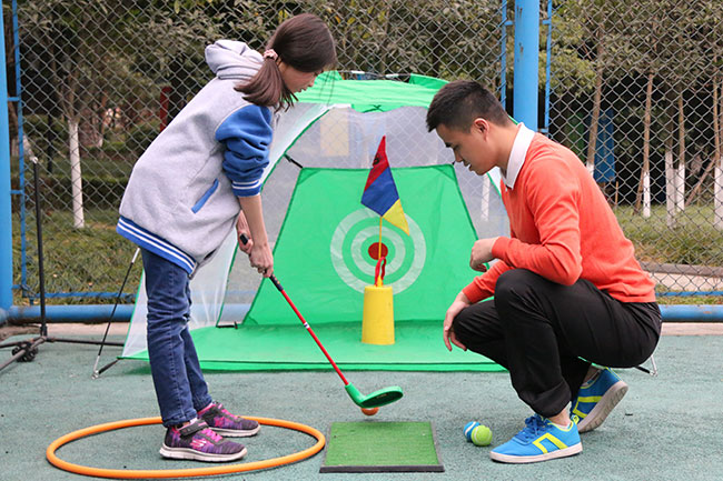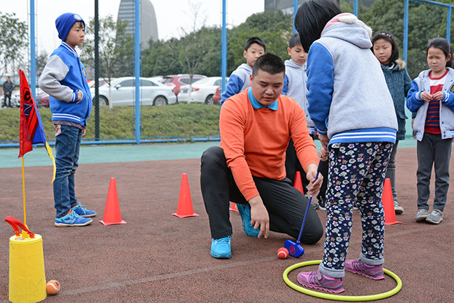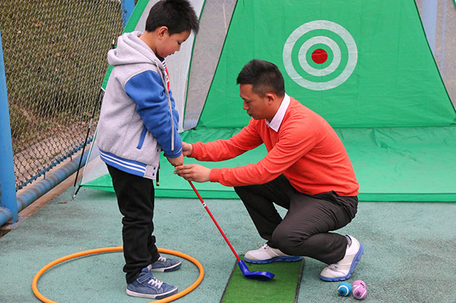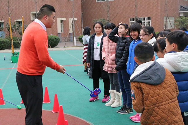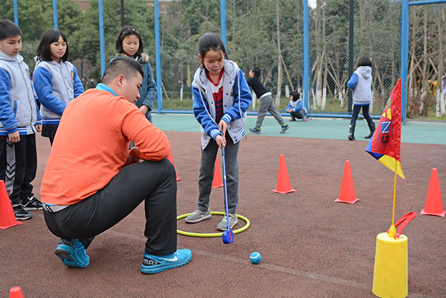 每一次的實踐課教練們都會背上重重的高爾夫運動器材走進教室向各班孩子介紹相關知識。同學們不僅了解了這項運動的起源、意義、相關禮儀,還觀看了著名高爾夫球員的相關視頻,從而對這項運動更加期待。接著,孩子們來到操場體驗高爾夫運動。教練們認真示范,以職業球員的實戰經驗來指導每一個孩子。他們融合一套健康科學的青少年教學體系,不僅專注于球技,也注重青少年運動技能開發,幫助孩子們全面健康成長。教練宣布運動規則,每一位同學興致盎然,他們專心致志,積極探究。從熱身運動開始,再到認識球桿,接著教練們示范握桿姿勢,每一個環節都講解得特別詳細。同學們眼中充滿期待,恨不得馬上可以擊出一球。