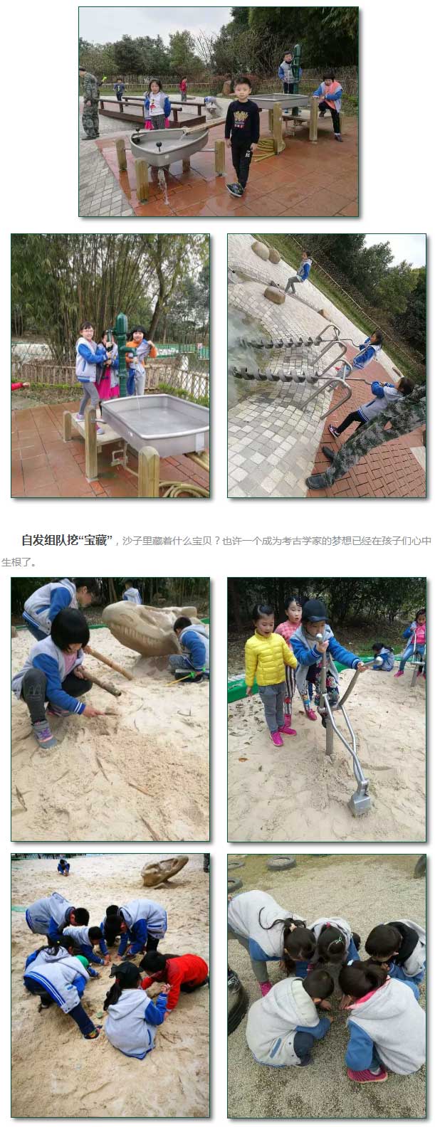瞧,林深處還有一處“遠古之地”呢!那里有種類豐富、姿態各異的“恐龍”。孩子們指著指示牌上的名稱,念到“雙冠龍、偷蛋龍、三角龍”……