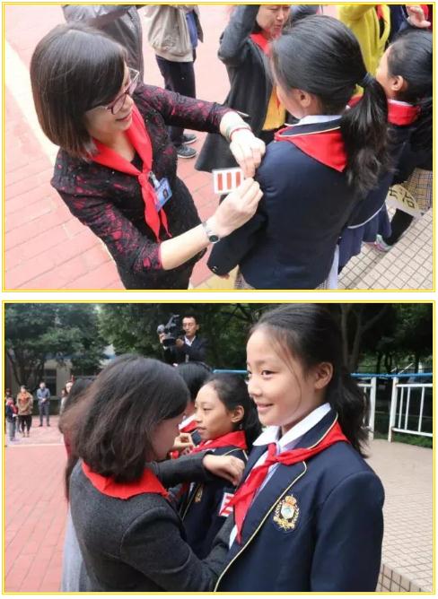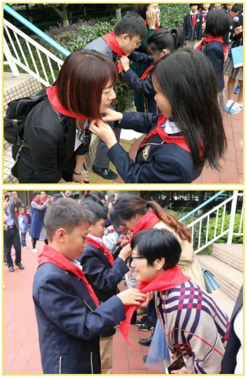 家校攜手 見證成長 一方紅領巾帶你憶往昔 瞧!我們的家長代表們也和我們一起度了這個難忘的建隊日活動,見證了一年級少先隊員這個光榮而幸福的時刻。 學習社區的小志愿者們在主席臺前為他們佩戴上了紅領巾。