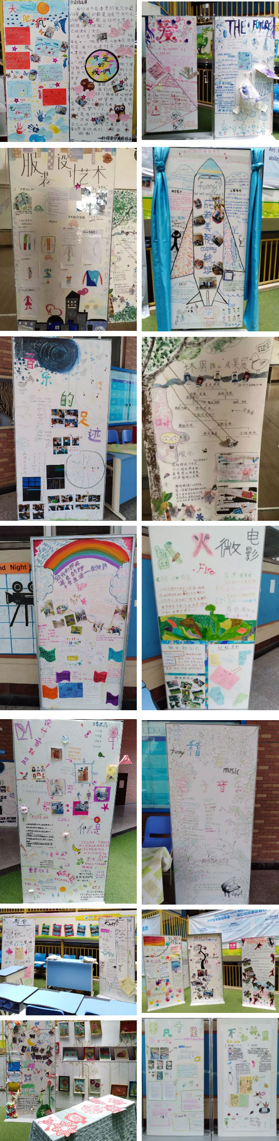 瞧!一塊塊豎立的精美展板全都手工制作完成。張揚個性的主題展板,概括了各個小組關于課題選擇、探究方法的點點滴滴,形象直觀地展示了孩子們在過去八周時間的探究歷程。