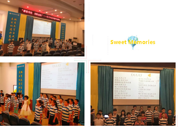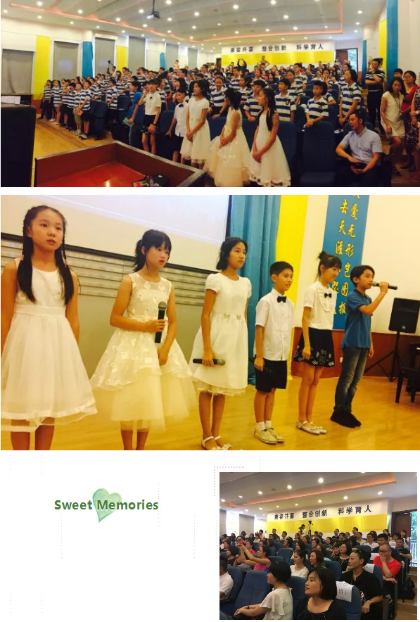 今天在畢業典禮上,我自豪地發現,在座的孩子們,依然綻開入學前一樣燦爛的微笑,依然保持著入學前一樣的純真的目光,還多了一些舉手投足間顯露的自信。他們不僅能用漢語講國學,更能輕松地用英語聊天,CHATTING and KIDDING。往日的微信上和墻上,是他們跨學科探究的小小成果。一轉眼,他們美滋滋與老師朝夕融洽相處了五年。