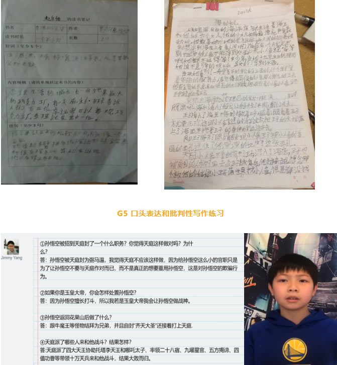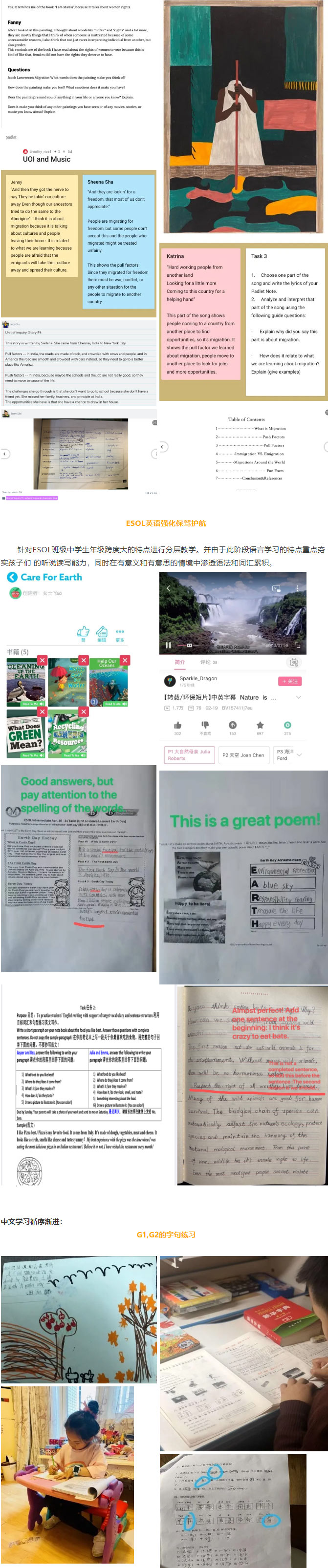 居家學(xué)習(xí)期間G5探究了屬于跨學(xué)科主題“我們所處的時(shí)空”下的話題“移民”。學(xué)生通過閱讀豐富的移民故事,分析移民原因,并將這些原因分為促使移出和移入兩種因素。通過使用老師給的引導(dǎo)性問題,培養(yǎng)閱讀和寫作技能。學(xué)生探究移民相關(guān)的詞匯,用以訓(xùn)練使用網(wǎng)絡(luò)詞典,以及正確的拼寫單詞。通過解讀由杰克博·勞倫斯創(chuàng)造的畫作,去理解人們?yōu)槭裁匆泼瘛Mㄟ^聆聽不同的音樂,理解和分析人們移民的原因和方式。學(xué)生圍繞移民提出成立自己的項(xiàng)目,通過研究過程,用不同方法展現(xiàn)對(duì)中心思想的理解。
