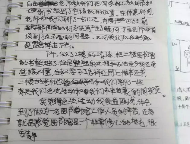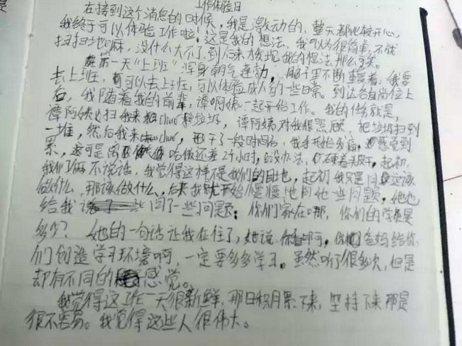 第一天上班,渾身朝氣蓬勃。腦子里不斷重復著:我要去上班!我可以去上班!可以體驗一下成人的日常生活!干了一段時間,我的手開始發(fā)痛、累、軟。這才10點呢,離下班還有2小時。沒法,只有硬著頭皮干。我這個工作唯一能接觸的人群就只有阿姨。于是,我開始提問,起初問一些工作上的。然后,阿姨也會順著我的提問問我一些問題。在這一過程中,阿姨的一句話把我鎮(zhèn)住了:“你看啊,你爸爸媽媽給你創(chuàng)造的學習環(huán)境多好啊,一定要多多學習。”這樣的話在其它場合聽了很多次,但這次聽起來特別有觸動。這一天的工作對于我來講很新鮮,但每天這樣堅持下來是很不容易的。我覺得做這些工作的平凡人很偉大。