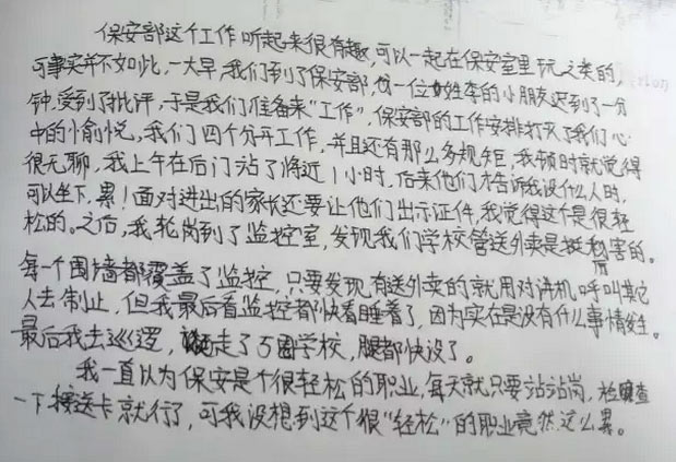 一直以為保安是一個很輕松的職業(yè),每天只要站站崗,檢查一下接送卡就行了。可我沒想到這個“輕松”的職業(yè)居然這么累。