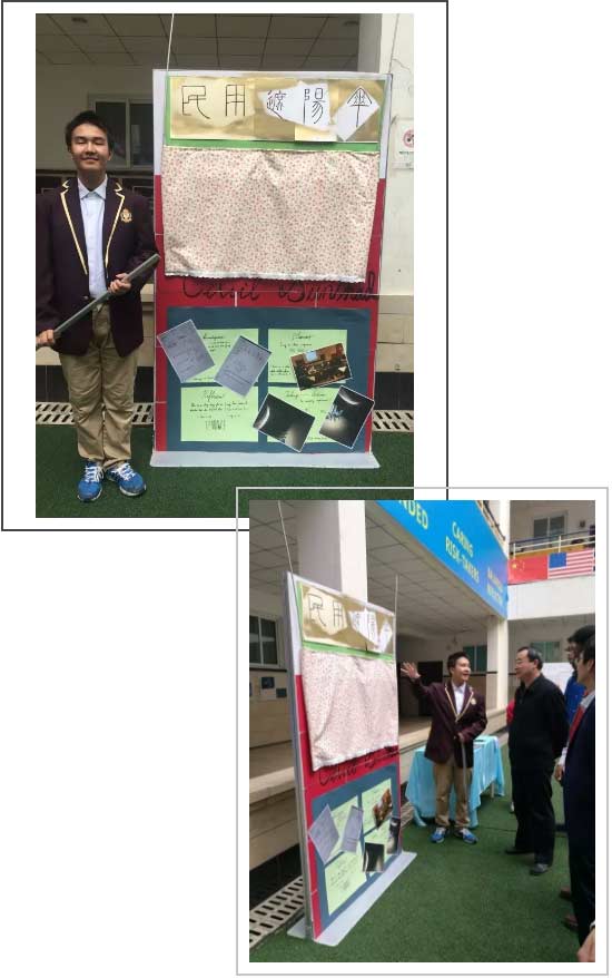 王芷妮同學(xué)關(guān)注全球背景中的“個體與文化的表達(dá)”。 她選擇了自己感興趣的川劇作為研究對象,采訪相關(guān)人士,親自學(xué)習(xí)川劇表演,并制作出視頻以使更多的年輕人認(rèn)識到川劇的魅力,并愛上川劇。 李星翰 民用遮陽傘