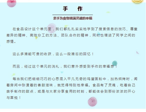 我們的作品并非完美,但同學們一直努力提升,新誕生的食品一個比一個美味可口。對了,老師們都超級捧場,很愛吃我們做的食品哦!