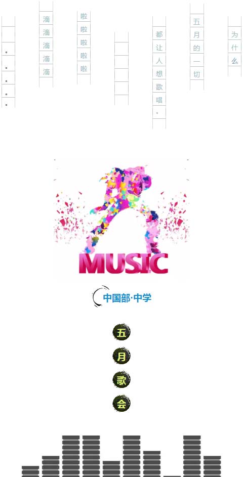 中國部•中學秉承學校“兼容并蓄,整合創新”的教育理念,一直致力于發展具有中學特色的“四化”建設。一年一度的五月歌會正是其中“培養目標全面化”和“育人過程陽光化”的體現。作為學校文化的建設的重要形式,歌會一直是美視美育的一個舞臺。