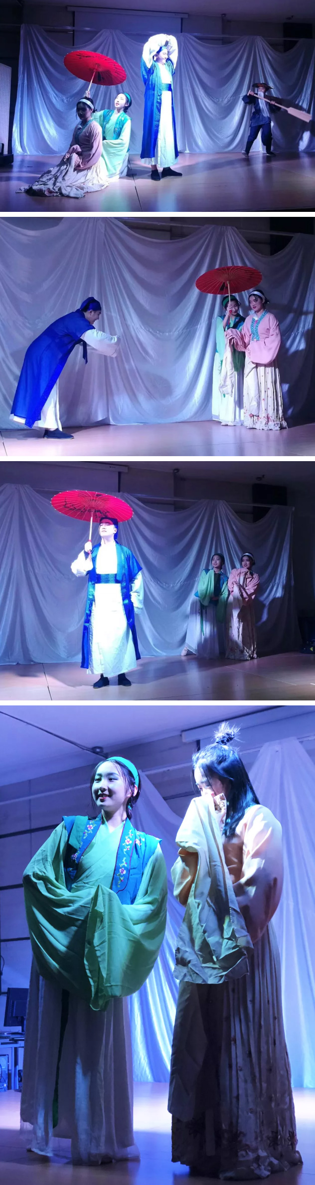 美視版《白蛇傳》節選“游船借傘”段落,借鑒田漢京劇版本的唱腔和念白,由美視融合部戲劇CAS組的同學們傾力打造。伴著電影《青蛇》的音樂,白素貞和小青用一支“蛇妖”舞蹈上臺,如此契合角色的姿態立刻吸引了大家的目光。白素貞穩重,小青熱情莽撞,許仙俊秀干凈,學生演員們將人物塑造的立體而生動,謝幕時,他們精湛的演出獲得了在場觀眾掌聲雷動。