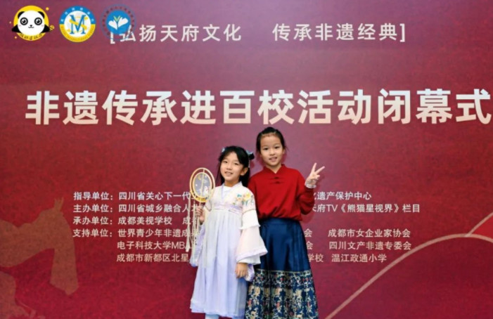 四川省非物質文化遺產保護中心和愛心企業代表一起為成都4001百老匯學校頒發“非遺傳承示范學校”獎牌。