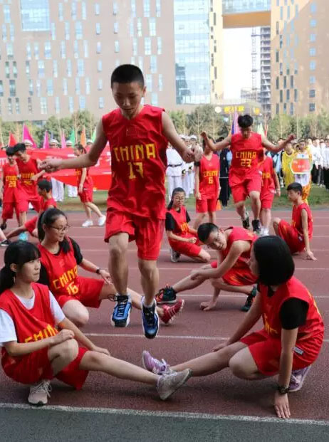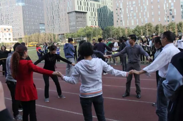 首先進行的人體呼啦圈由八位老師參賽,參賽老師手拉手圍成一圈,不通過手將呼啦圈傳遞兩圈,計時最短的隊伍獲勝。比賽開始后,八個參賽小組爭分奪秒,靈活的身體穿梭于呼啦圈中。最終,高二年級組獲得冠軍,生活老師組和MYP項目組分獲二三名。