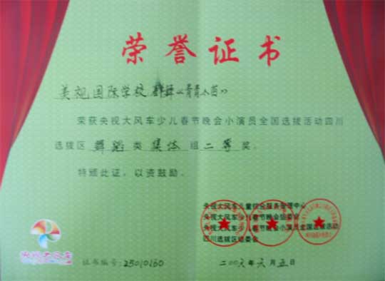 我校群舞《青青小苗》榮獲央視大風車少兒春節(jié)晚會小演員全國選拔活動四川選拔區(qū)舞蹈類集體組二等獎(07/06)