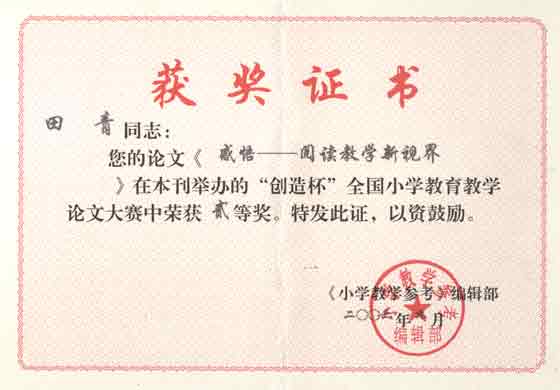田青老師的論文《感悟——閱讀教學(xué)新視界》在《小學(xué)數(shù)學(xué)參考》舉辦的“創(chuàng)造杯”全國小學(xué)教育教學(xué)論文大賽中榮獲二等獎(09/06)